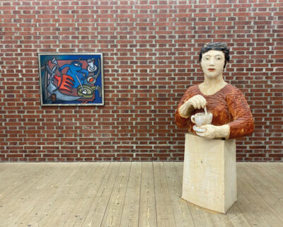 Abb: Ausstellungsansicht, links: Peter Krusche, Tischstillleben vor Blau, 1984, rechts: Raimund Göbner, Salon de thé, 2004, Foto: Künstlerhaus Marktoberdorf