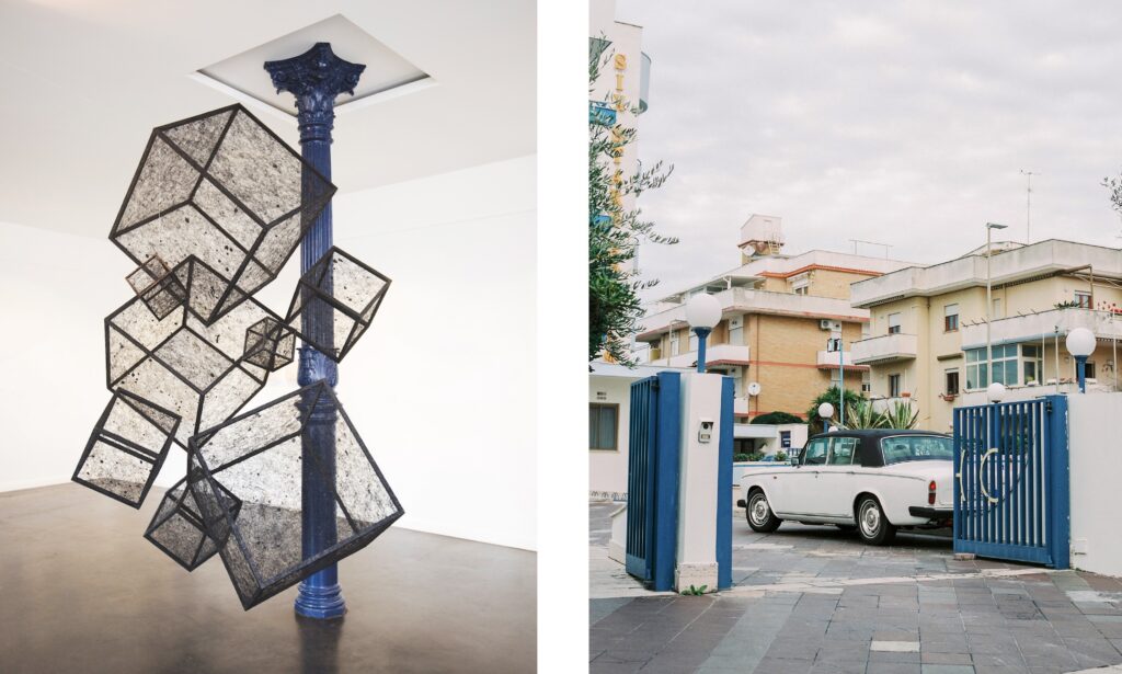 links: Katharina Lehmann, Black Cubes Solos; variable Größe, 2016, Garn, Acryl, Holz, Foto: Arlet Ulfers rechts: Julia Smirnova, White Car, Blue Gate, 15,6 x 15,6 cm, 2024, analoge Fotografie, Pigmentdruck