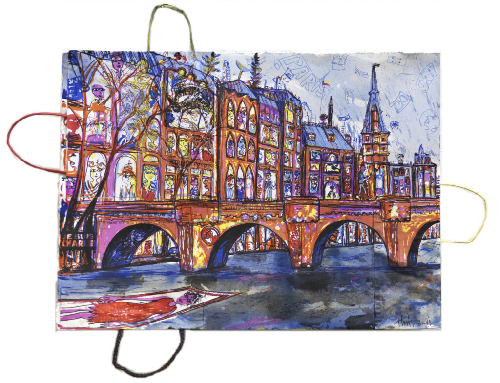 © THITZ: „Paris Pont“, 40 x 54 cm, 2017, Künstlersiebdruck auf Tüten und Büttenpapier