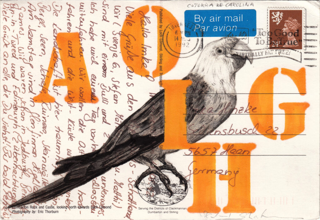 Der Berliner Roland Stratmann ist ein virtuoser Zeichner, ein vielseitig denkender und vielschichtig arbeitender Künstler. Eines seiner bevorzugten Materialien sind beschriftete, frankierte und verschickte Postkarten, die er in großer Zahl sammelt und mit der Schriftseite zu seinen Bildhintergründen macht. Die darauf entstehenden naturalistischen Tuschezeichnungen verschränken sich mit den Texten der Postkarten und den prominent ins Bild gesetzten Titelzeilen zu höchst komplexen Bild-Text-Kombinationen, die konzeptionellen Hintersinn, Bild- und Sprachwitz miteinander verbinden.