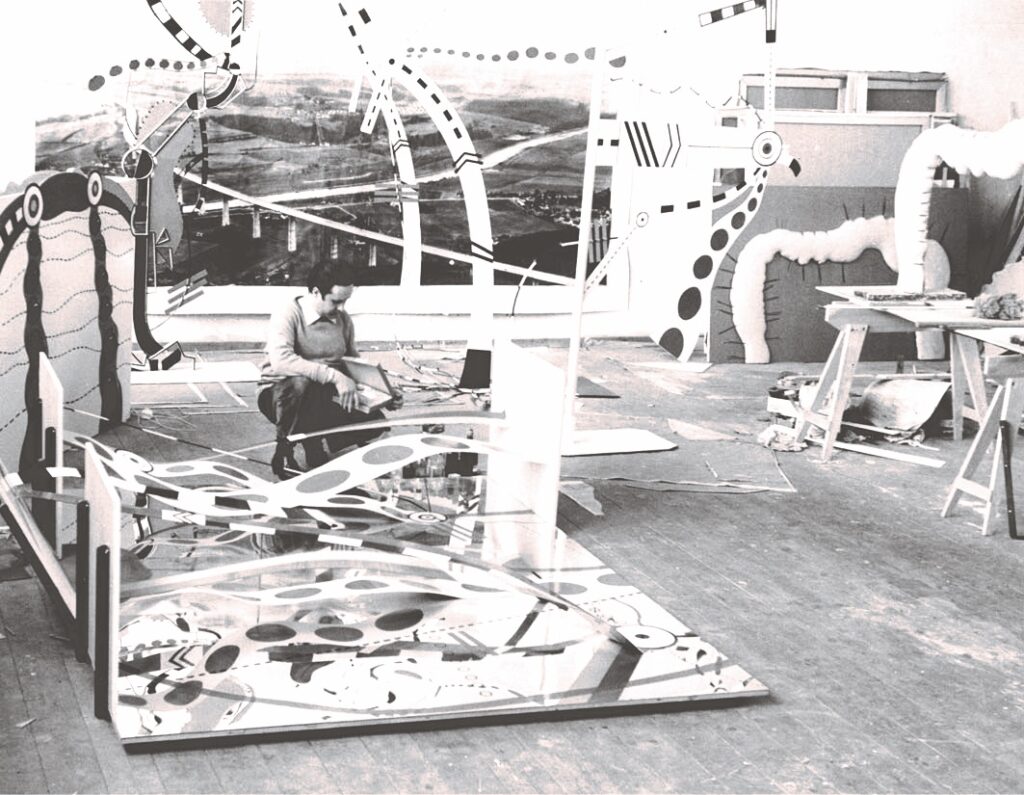 Peter Brüning in seinem Atelier in Ratingen, 1967, Fotograf: Manfred Leve, s/w Fotografie, Museum Ratingen; © Nachlass Manfred Leve, 2024; © Nachlass Prof. Peter Brüning, Ratingen und VG Bild-Kunst, Bonn 2024