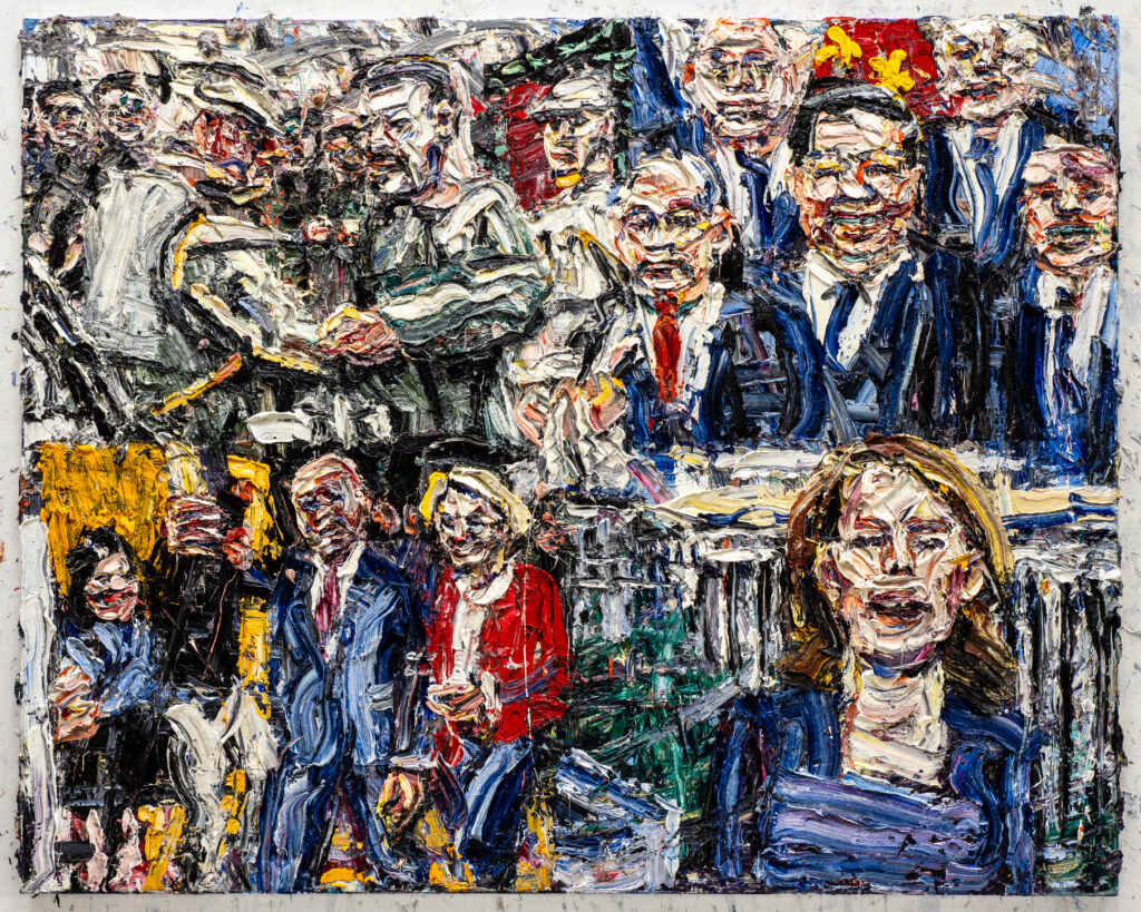 Harald Kille, Präsident Selenskij im Gefechtsstand / asiatisches Gipfeltreffen mit den Präsidenten Putin und Xi Jin Ping / Wirtschaftsforum Davos: Klaus Schwab und Ursula von der Leyen / Außenministerin Annalena Baerbock in Berlin, aus der Serie „Ukraine 1“, 2023, Öl auf Jute, 160 x 200 cm