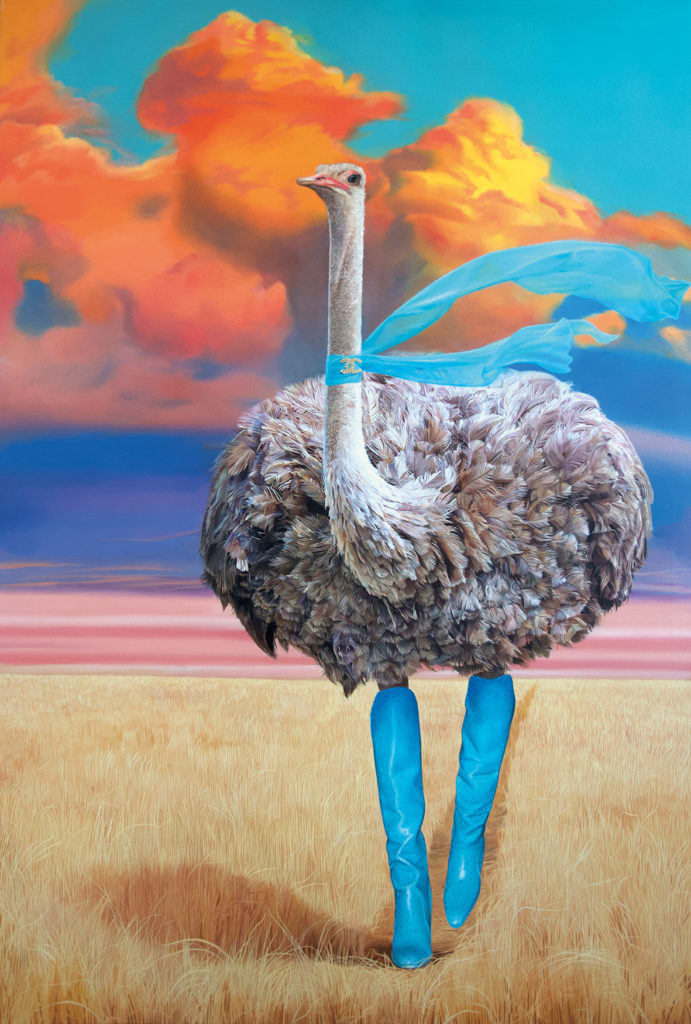 In Czaplas Wald- und Steppenlandschaften können einem seltsame Tierwesen wie dieses begegnen: ein stolzer Strauß in bonbonblauen Overknees-Stiefeln mit wehendem Chiffonschal um den schlanken Vogelhals. Der in Berlin lebende Künstler verbindet altmeisterliche Malerei mit verwirrend menschlich wirkenden Tiermotiven die uns bewusst machen, dass Tiere Wesen sind, über die der Mensch nicht nach Belieben verfügen kann.