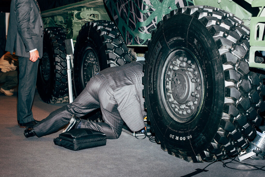 Nikita Teryoshin (*1986) widmet sich in seiner fotografischen Arbeit den oft übersehenen Seiten des modernen Lebens. Mit kritischer Schärfe, visuellem Witz und einem feinen Gespür für Ironie dokumentiert er gesellschaftliche Widersprüche, Machtstrukturen oder ökonomische Zusammenhänge. Große Aufmerksamkeit erregte zuletzt seine Langzeitserie „Nothing Personal: The Back Office of War“, welche die Anonymität und Absurdität internationaler Waffenmessen dokumentiert. Fernab der Schlachtfelder, auf denen die Folgen sichtbar werden, zeigt Teryoshin die makellosen Kulissen eines milliardenschweren Geschäfts, das tödliche Technologien wie harmlose Konsumgüter inszeniert.