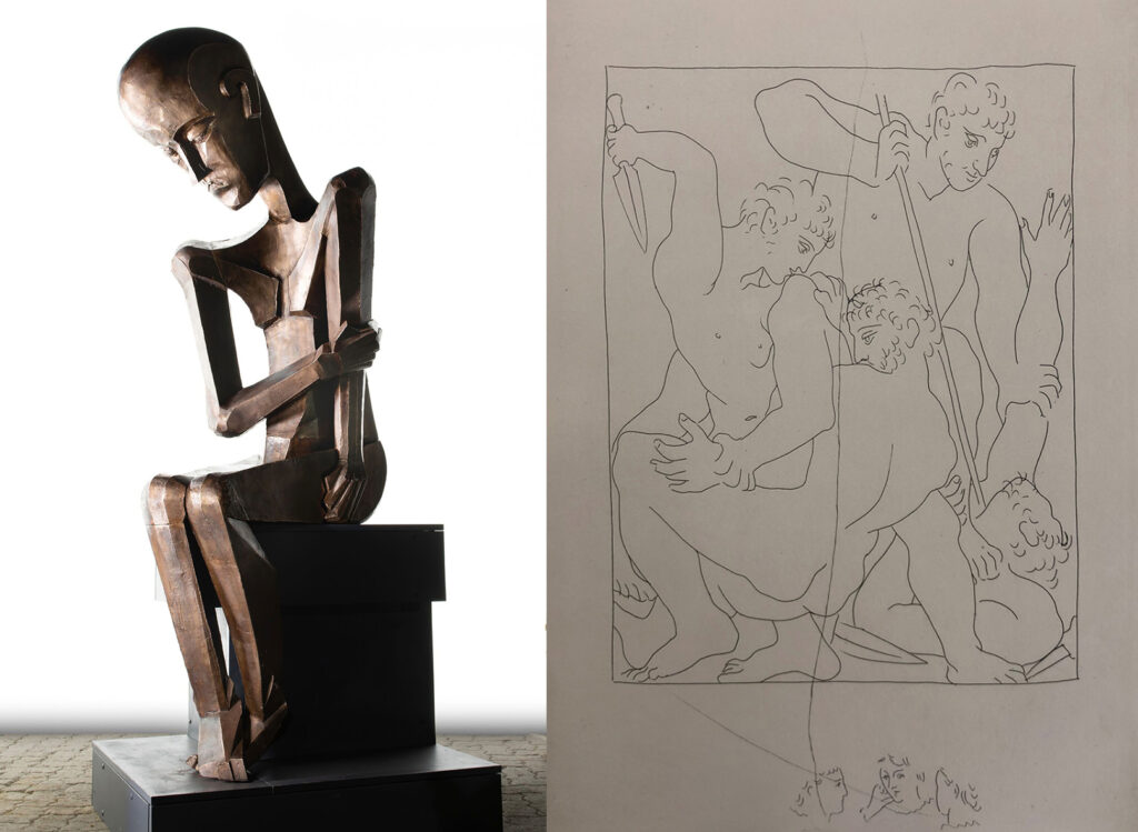 links: Andreas Rimpel: „Der Grübler“, 2019, Bronze, 230 x 100 x 50 cm; rechts: Pablo Picasso: „Eaux-fortes pour les Métamorphoses d'Ovide“, 33 x 25 cm