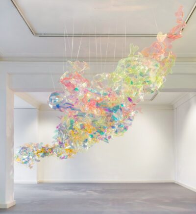 Berta Fischer (*1973) verwendet transparente Materialien wie thermoplastisches Acrylglas in verschiedenen Farben, Stärken und Größen, um einen subtilen Dialog über die Natur von Form und Licht zu führen. Das Ergebnis ihrer Arbeit erinnert an glänzende oder reflektierende High-Tech-Stoffe und virtuelle Zeichnungen, die in einer kreisenden Bewegung im Raum schweben. Jenseits der Schwerkraft machen ihre Arbeiten das Ungeordnete, Chaotische und Unvorhersehbare sichtbar. Im lichtdurchfluteten oberen Ausstellungspavillon des Skulpturenpark Waldfrieden zeigt Berta Fischer u. a. eine Adaption einer ihrer Arbeiten, die wie eine Wolke im Raum schwebt.